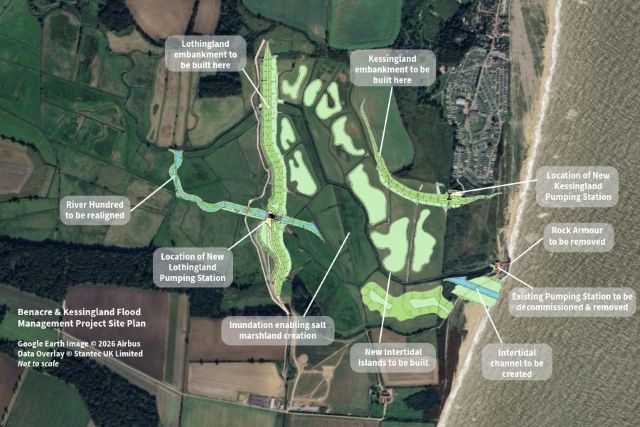 The Benacre & Kessingland Flood Management Project aims to reduce flood risk in Kessingland and the Lothingland Valley while delivering wider environmental and community benefits. Construction began in Spring 2025 and is expected to finish by Summer 2030.